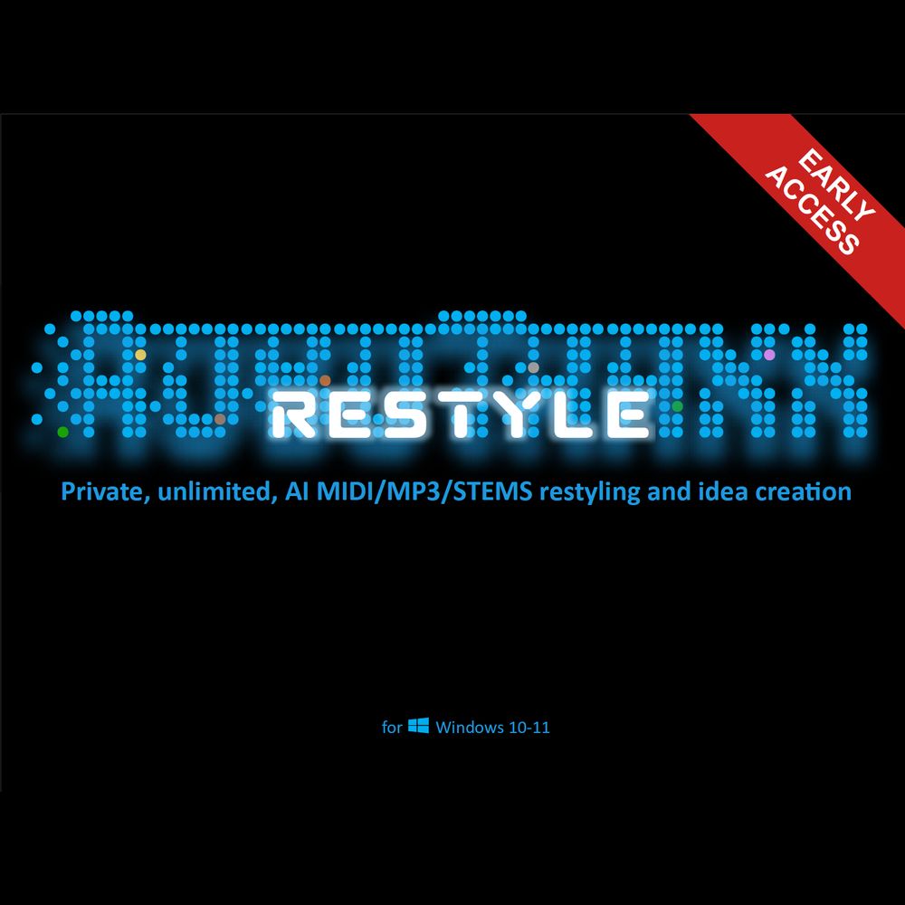 Private, unlimited, royalty free AI song restyling and idea creation. RoboTraxx ReStyle provides rapid music genre restyling with up to 5 interlinked AI modules providing precision down to individual note level. Download expansion styles for unlimited creativity. Quickly preview options including style strength, phrasing flow, note density and instrumentation. Input/output MIDI, MP3, and stems for your digital music projects. Let the AI modules work independently, or function together as a linked ensemble. Minimum system requirements: Windows 10+ 4GB RAM Pro license options for additional features: link Styles Library for all licenced users: link User Manual: link Version 1.06.0 Pro license additional features Unlimited cooridinated AI creation across Drumz, Baselinez, Leaz, Keyz and Stringz AI modulesFree access to RoboTraxx Premium StylesPremium style exporting of MIDI, MP3, WAV, Stems